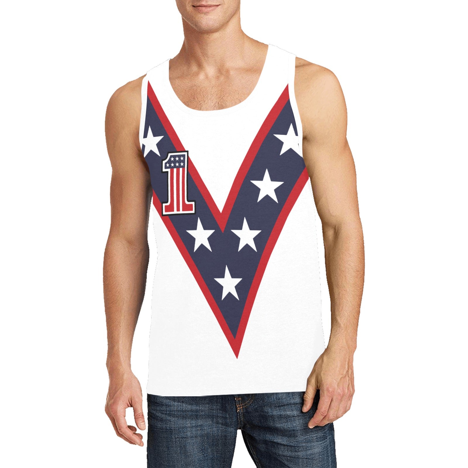 Rev it up and fly high in this American Daredevil Tank, inspired by classic stuntmen who risked it all in red, white, and blue. Featuring a bold “V” chevron with stars and stripes and a vintage-style #1 badge, this tank brings the thrill of danger and the swagger of freedom to your everyday style.