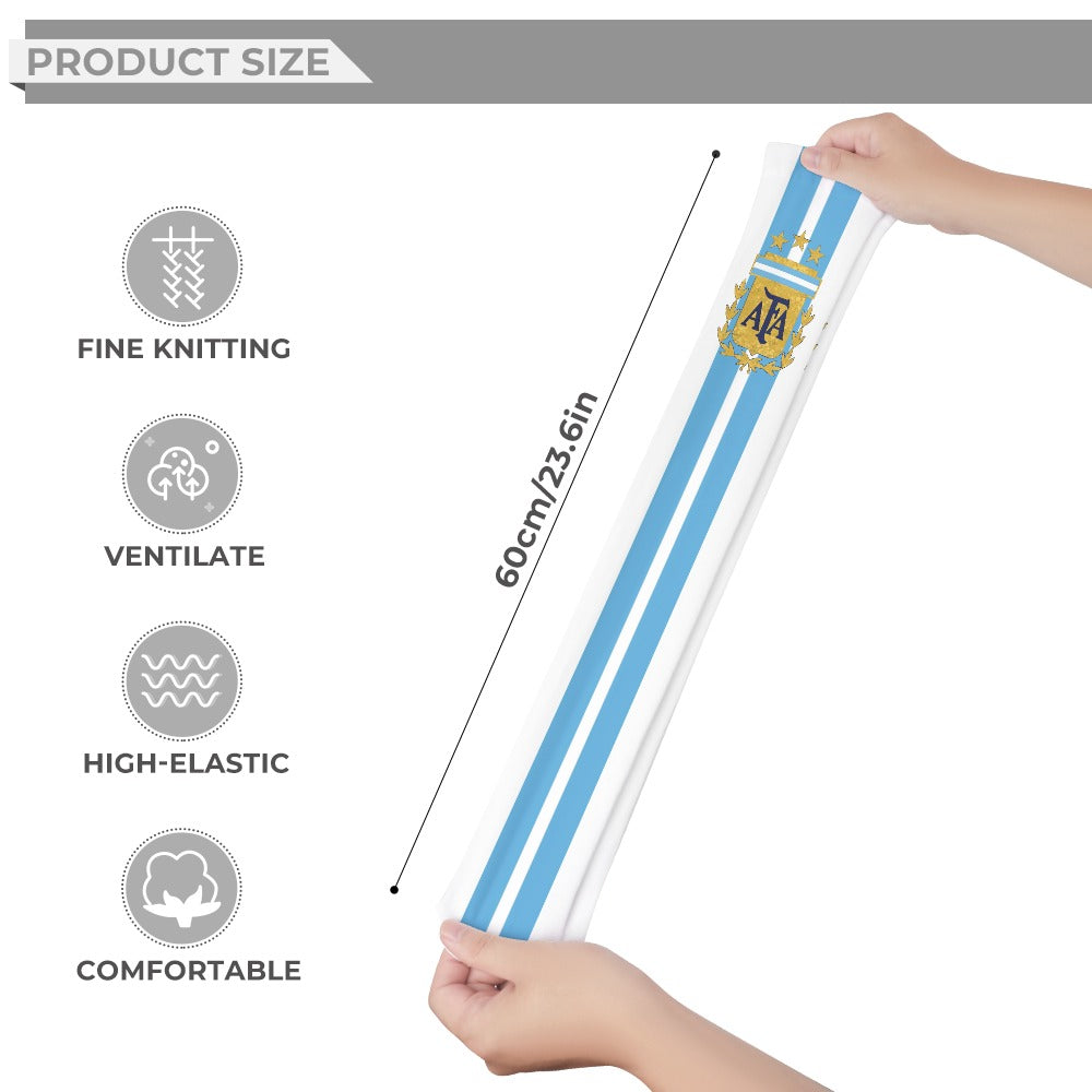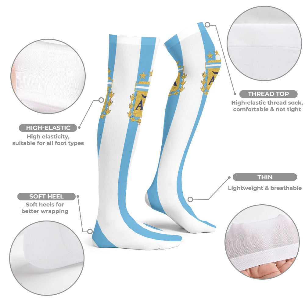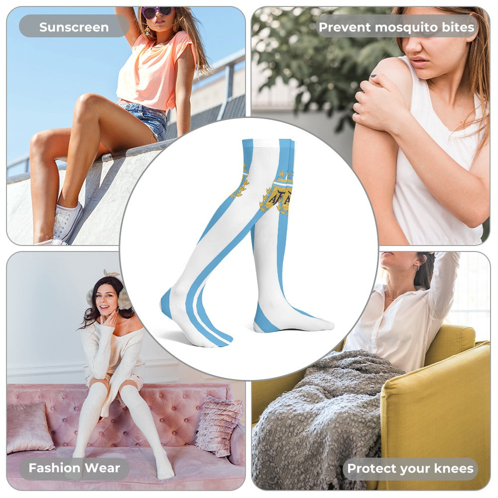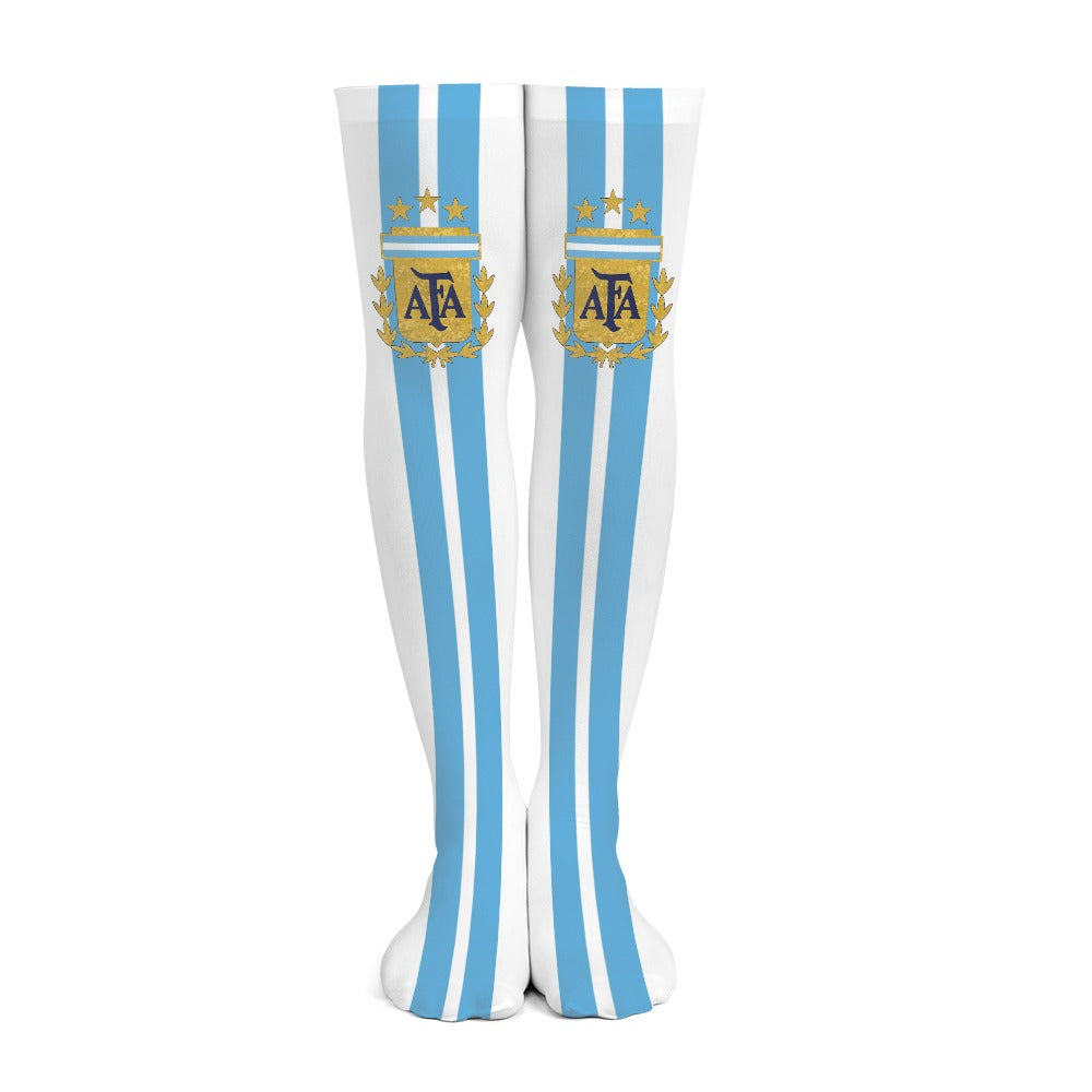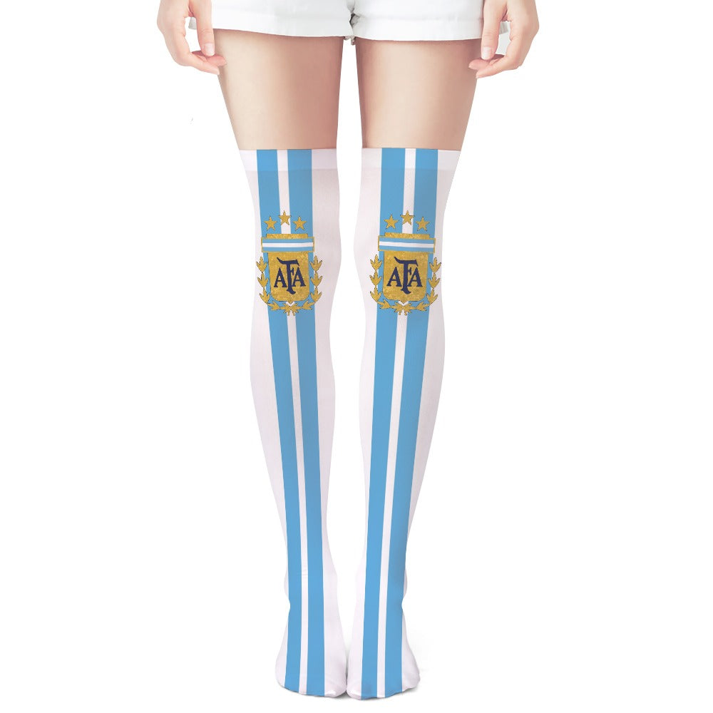 ⚽ Show your love for Argentina football in bold style with these eye-catching over-the-knee stockings. Featuring the iconic blue and white stripes and the AFA crest, these thigh-high socks are perfect for match days, fan outfits, cosplay, or sporty everyday looks.