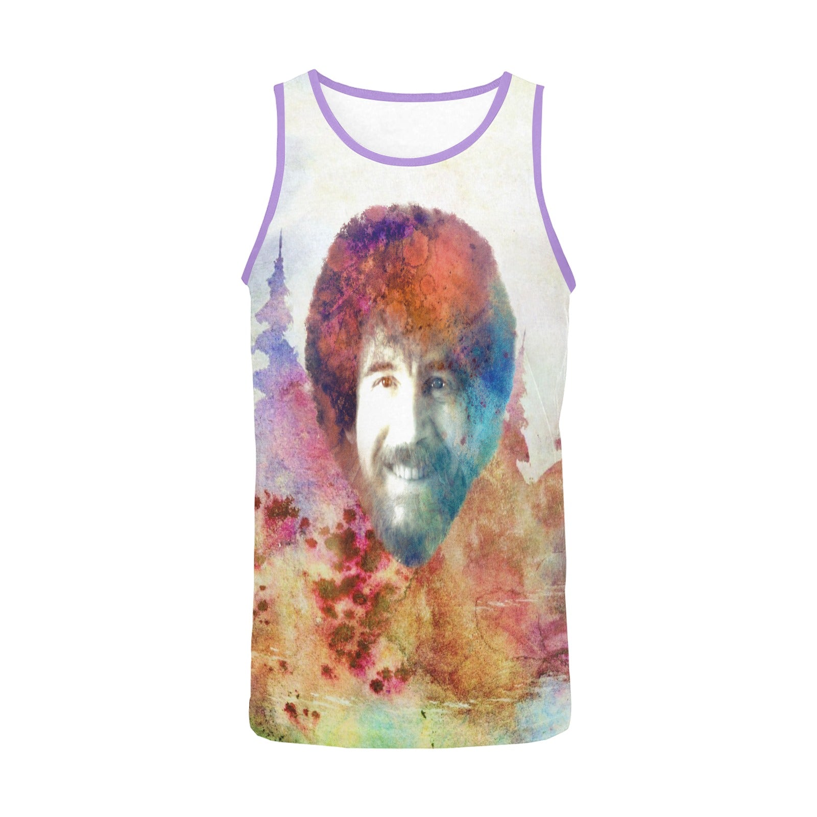 Celebrate the peaceful spirit and timeless joy of Bob Ross with this vibrant tribute tank top. Featuring his smiling face emerging from an explosion of watercolor textures and pastel hues, this design feels like one of his iconic landscapes come to life.