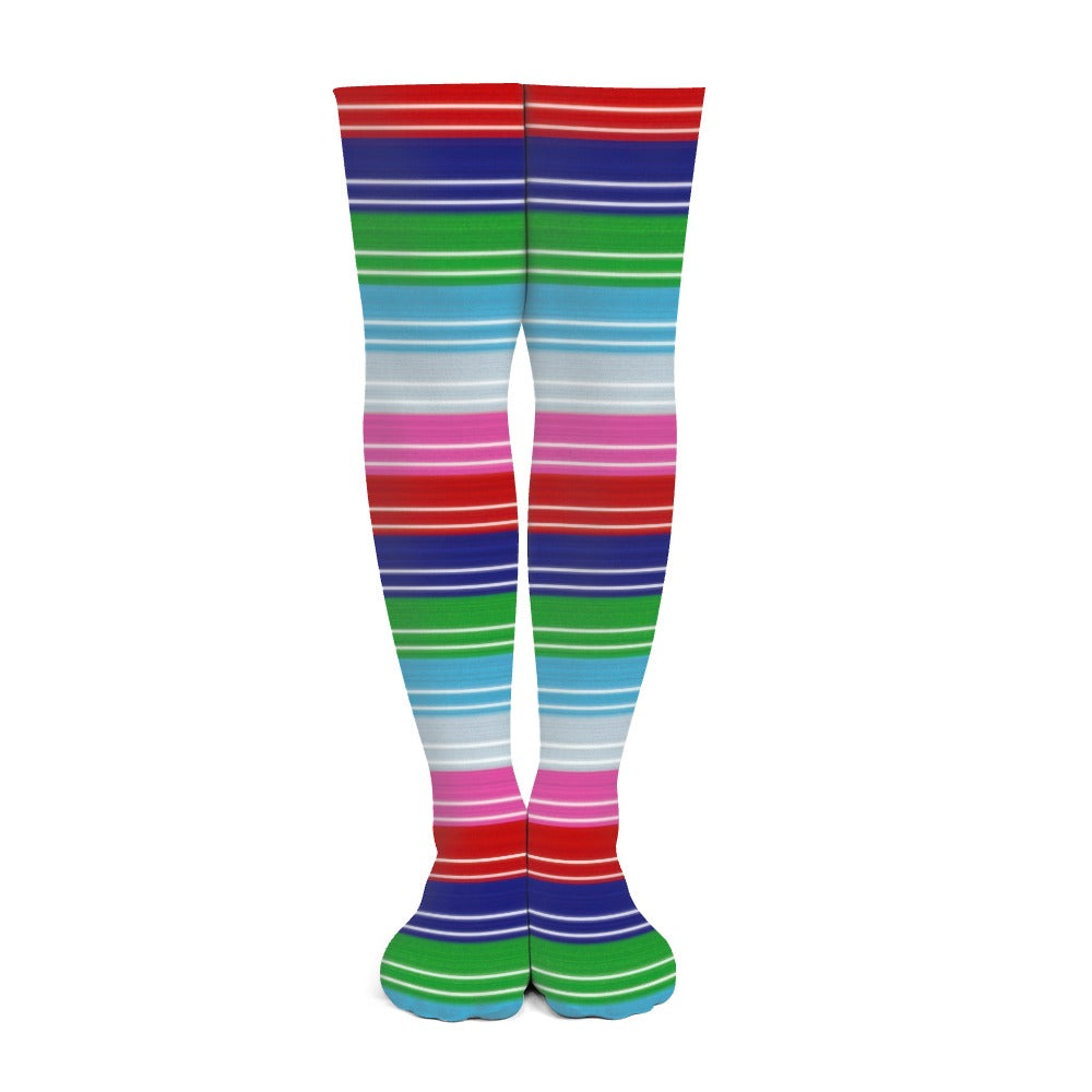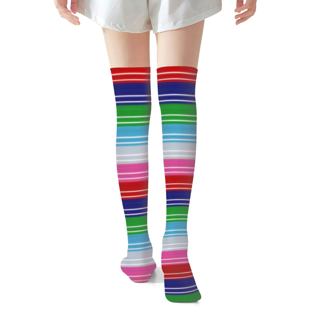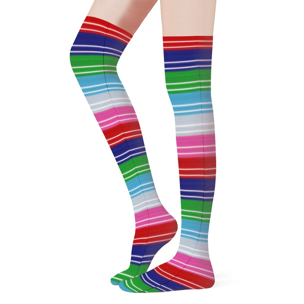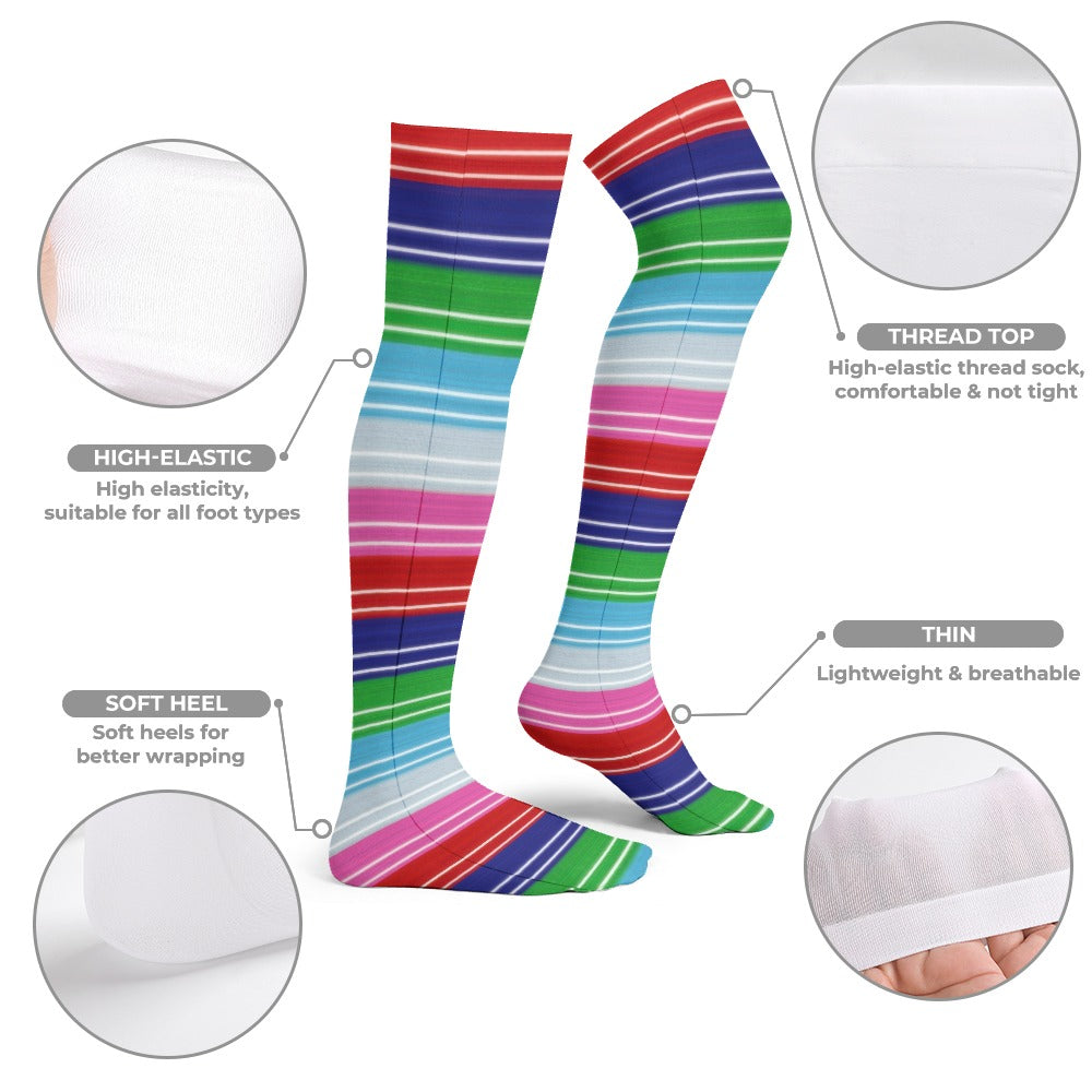 These thigh-high stockings (over-the-knee socks) feature the unmistakable Chucky sweater–inspired striped knit pattern — bold, colorful, and instantly recognizable. Wear them as a statement piece with boots or sneakers, style them for streetwear, or use them as a costume-ready accessory for horror nights, parties, cosplay, or Halloween.