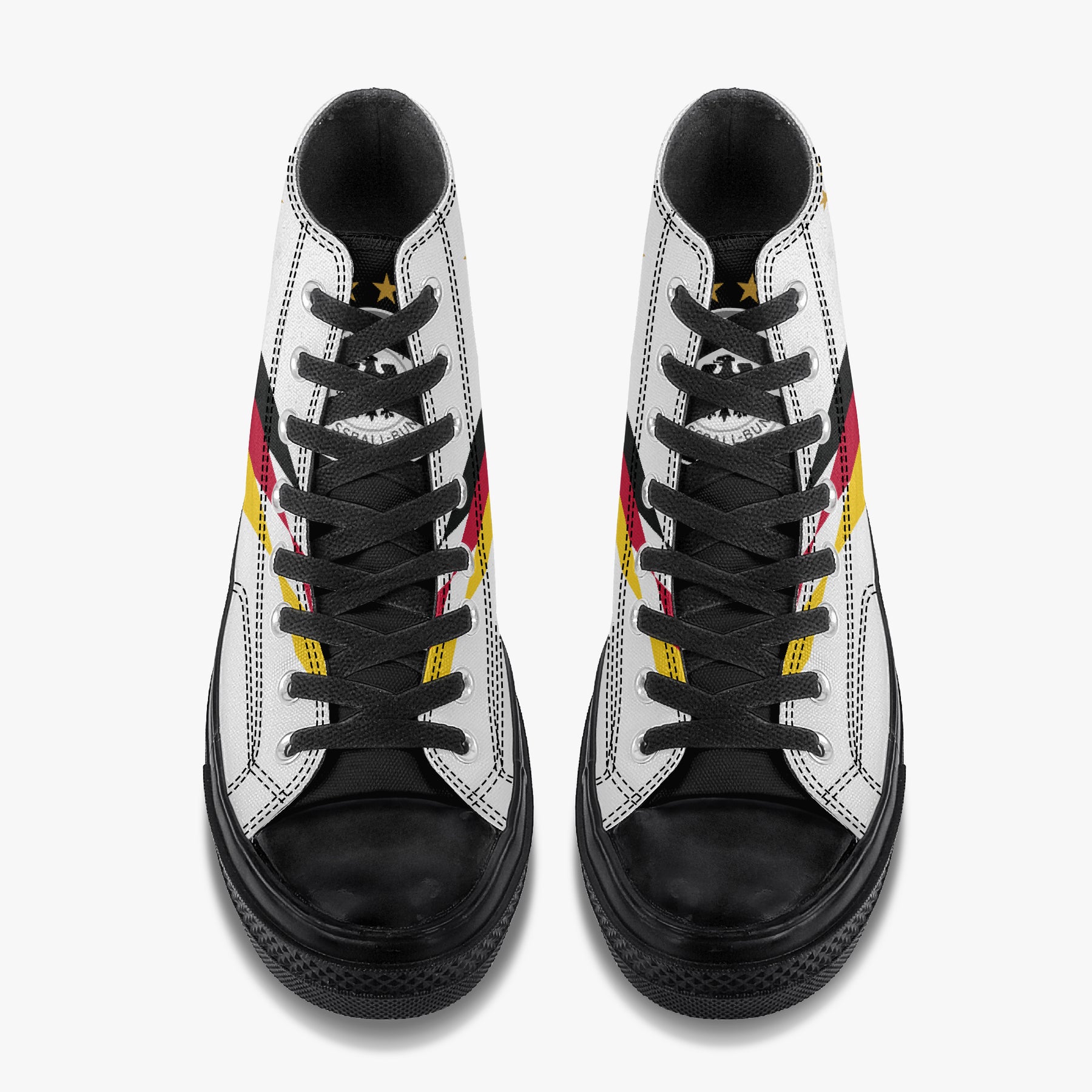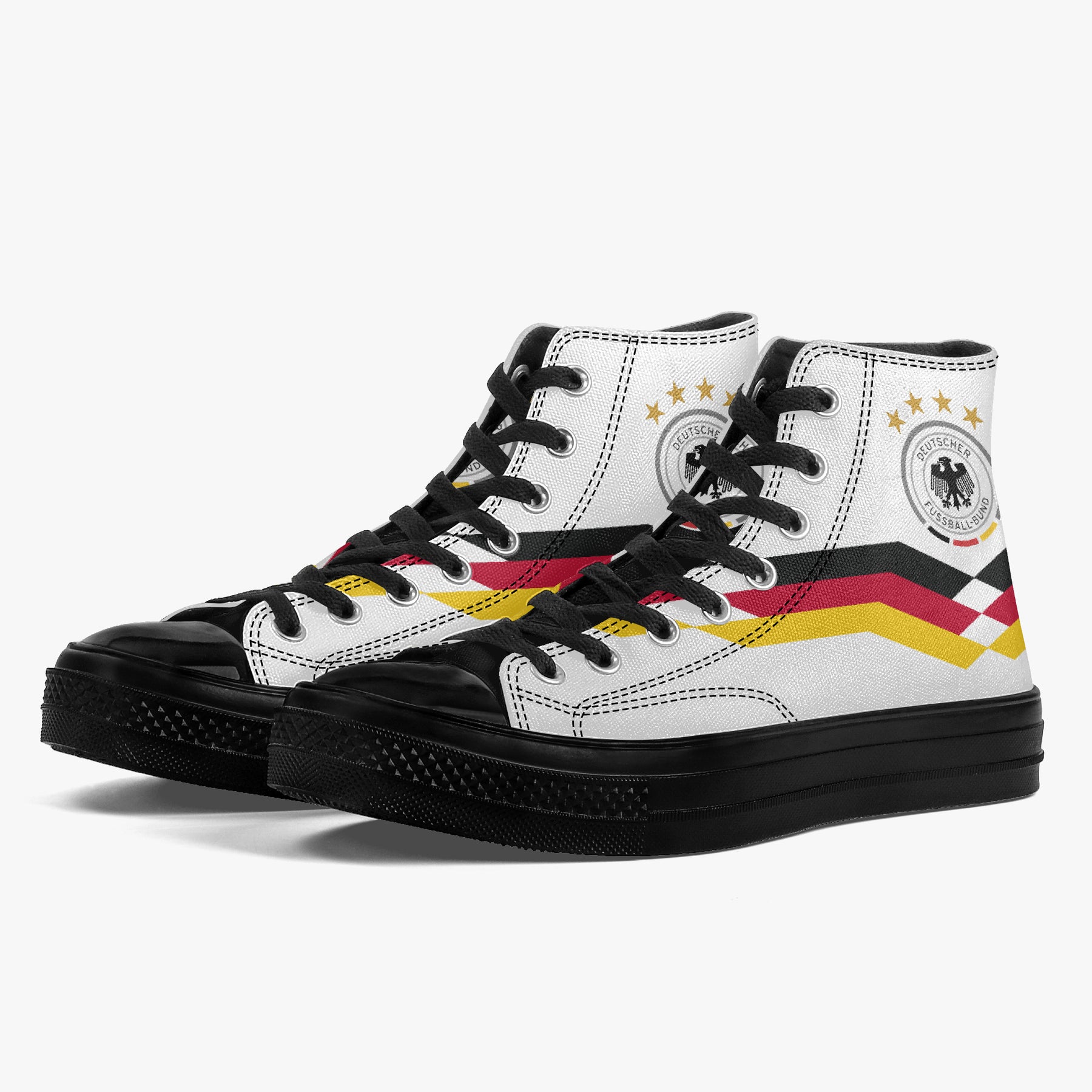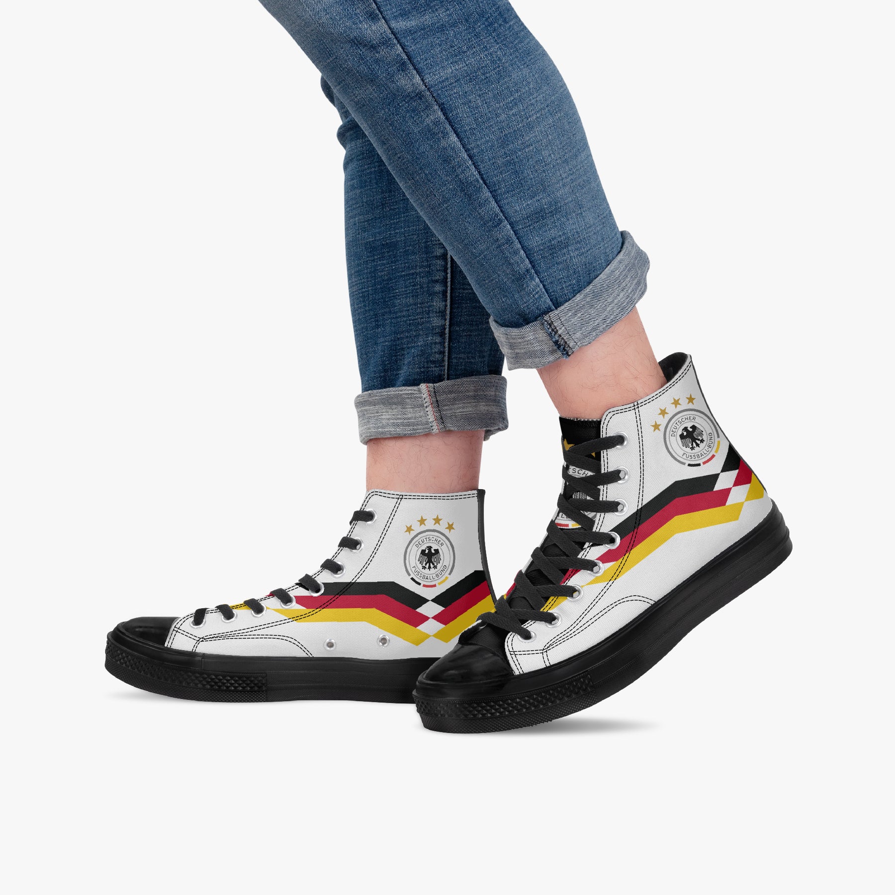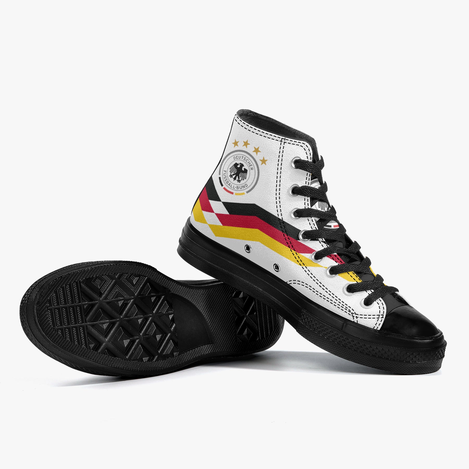 Inspired by classic German national team aesthetics, these high-top canvas shoes channel vintage World Cup energy with a clean, graphic design and timeless black-red-gold details. A retro football tribute reimagined as everyday streetwear.