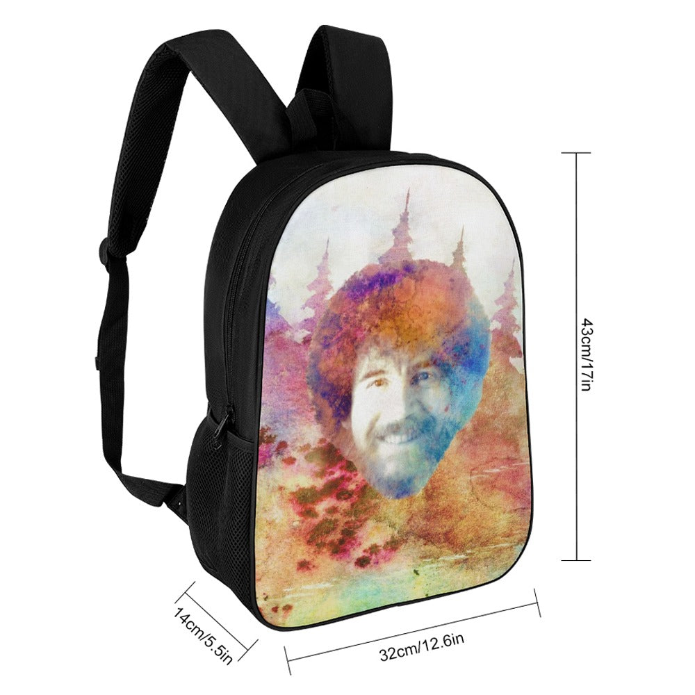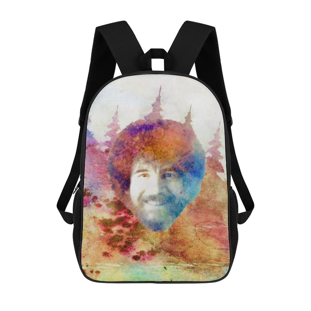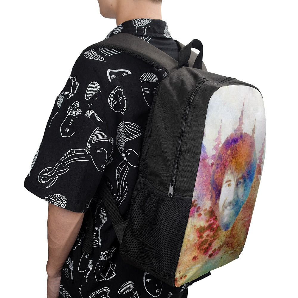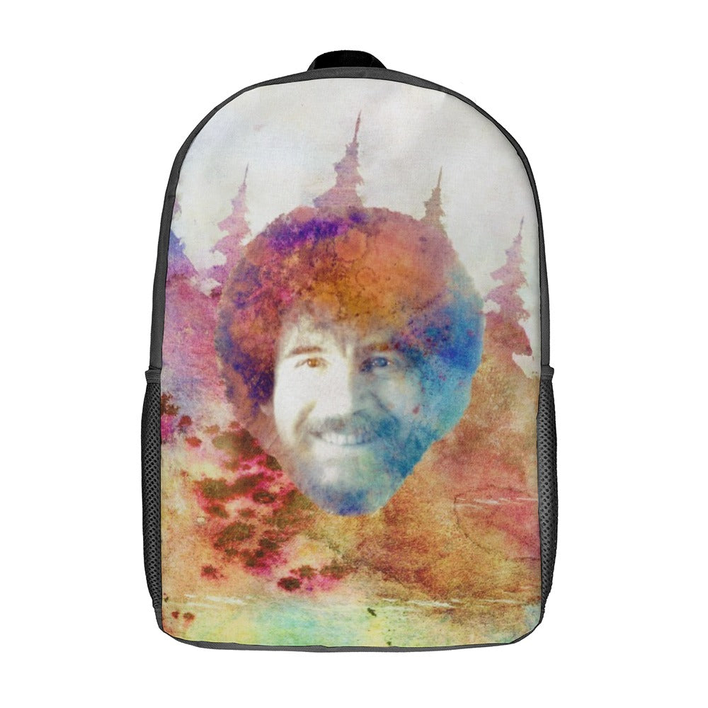 This artistic backpack is a tribute to the calm, joyful painting philosophy made famous by Bob Ross. Featuring a dreamy portrait blended into soft landscapes and “happy little trees,” the design captures the spirit of peaceful creativity and expressive nature art.