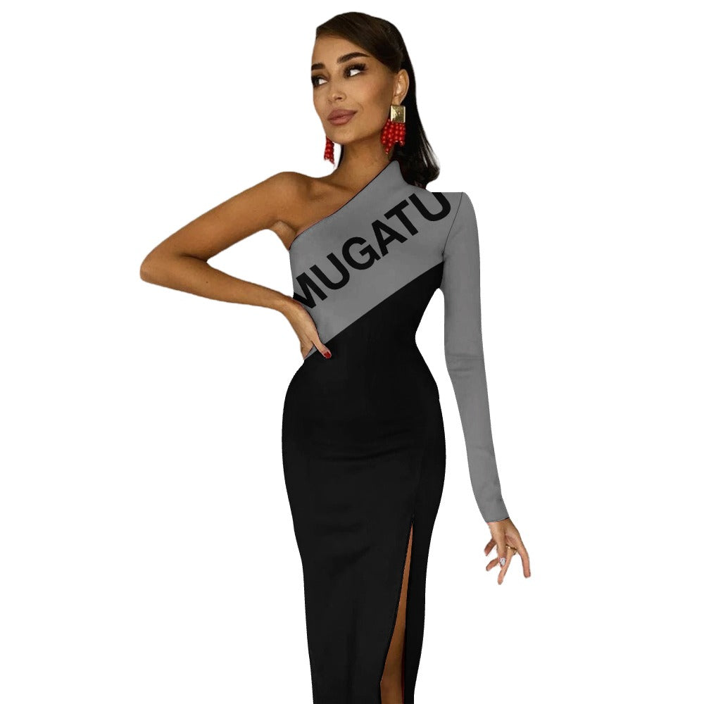 This one-shoulder bodycon dress features a bold diagonal MUGATU graphic, directly referencing the iconic villain from Zoolander. Clean, graphic, and unapologetically ironic, it transforms a cult-film reference into a sharp fashion statement.