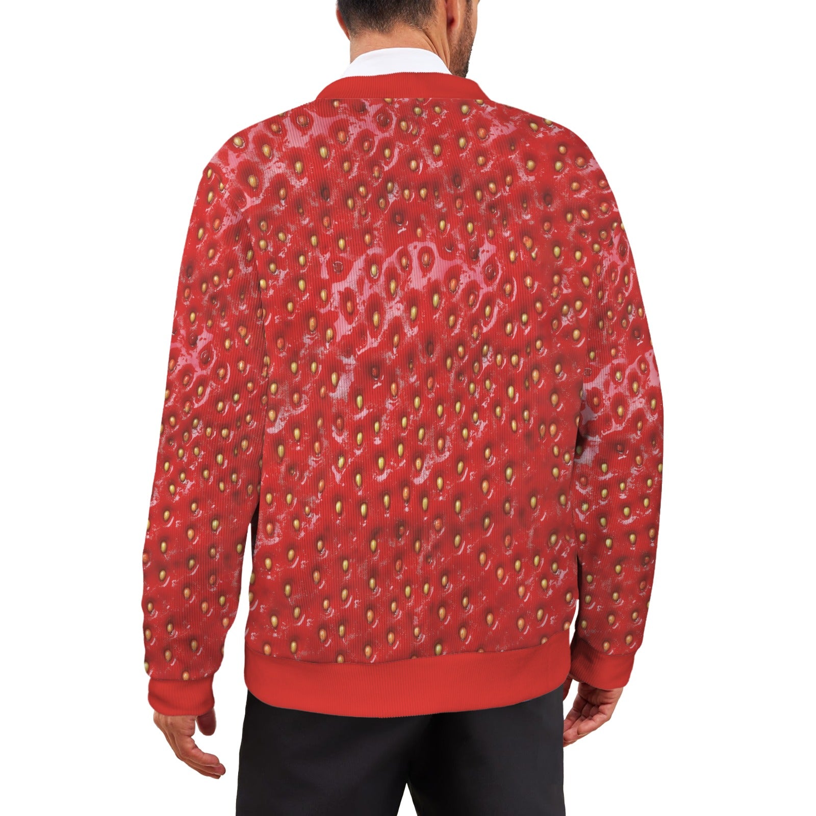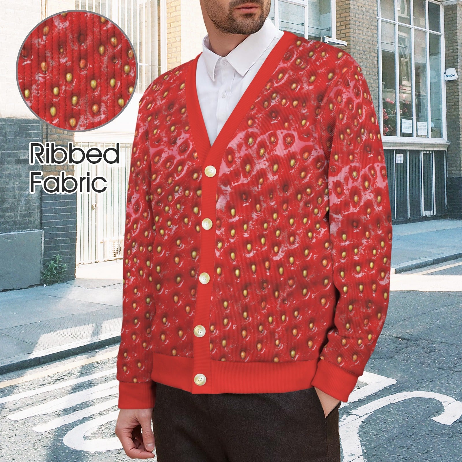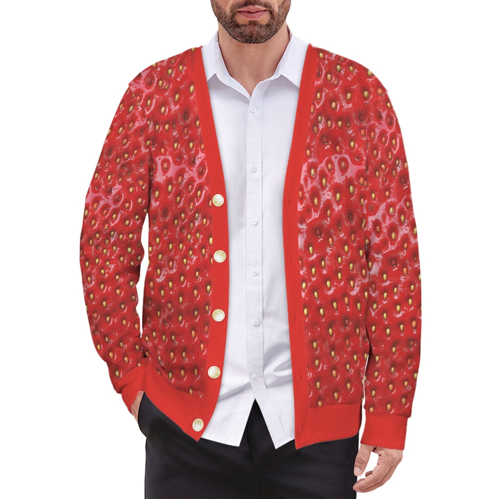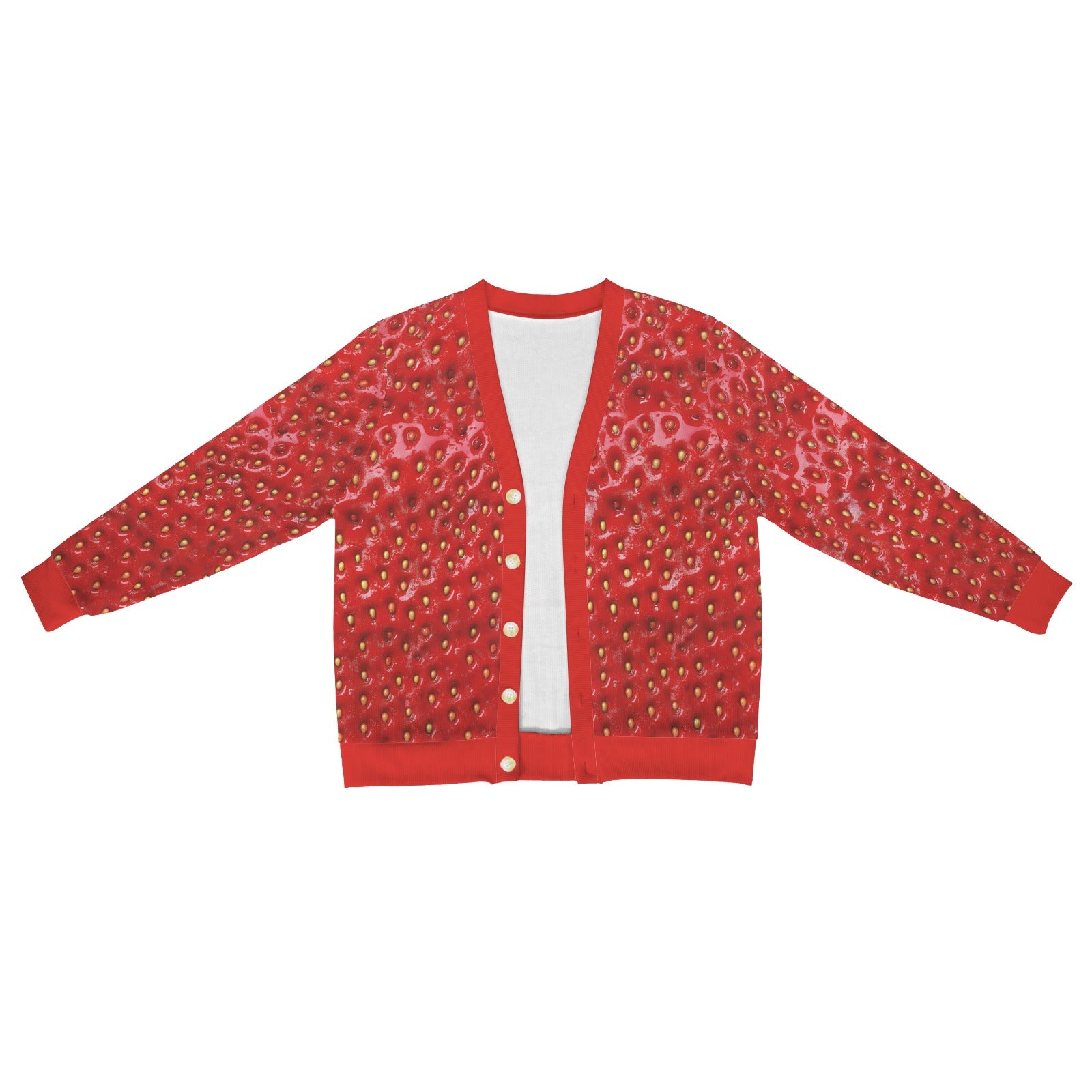 A bold and playful cardigan featuring an all-over strawberry-inspired pattern in vibrant red tones. Designed for everyday wear with a creative twist, this piece works effortlessly as a statement outfit, a fun gift, or an eye-catching layer for casual events and parties. Perfect for those who like their style sweet, ironic, and unapologetically different.